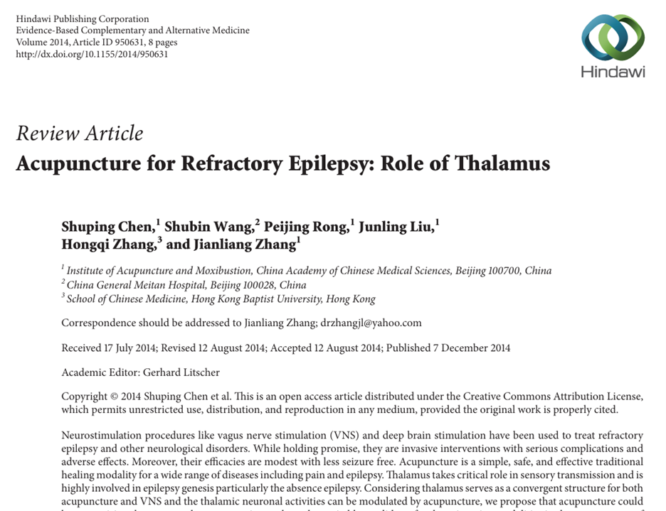Conclusion: The thalamus is a crucial structure in epilepsy generation and propagation as well as neurostimulation and acupuncture treatment. Acupuncture could evoke sufficient inhibition to modulate or interrupt the pathological oscillation within the thalamus and the cortex attributable to seizure generation and propagation. Acupuncture can also be involved in modulation of synaptic plasticity, neurotransmitters metabolism and neural reconstruction. These can eventually prevent seizure onset and propagation.